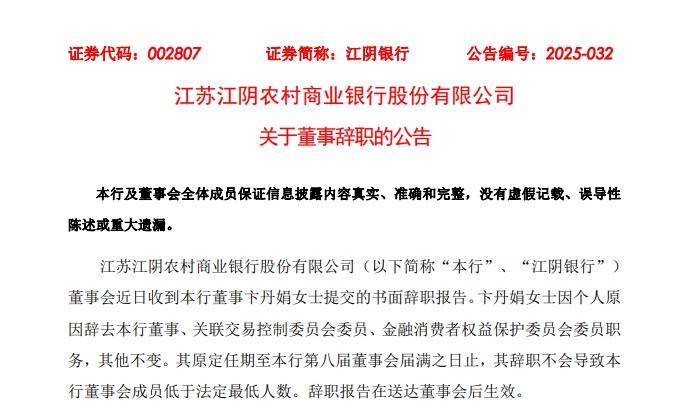 日前,江阴银行发布公告,该行董事会近日收到董事卞丹娟女士提交的书面辞职报告。卞丹娟女士因个人原因辞去该行董事、关联交易控制委员会委员、金融消费者权益保护委员会委员职务,其他不变。其原定任期至该行第八届董事会届满之日止,其辞职不会导致该行董事会成员低于法定最低人数。辞职报告在送达董事会后生效。